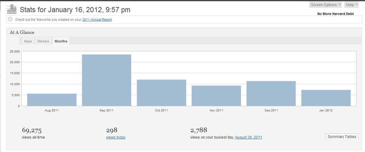 I started this blog on August 29th. Four and a half months later, as of 9:57 on 1/16, I’ve published 73 posts comprised of 95,000 words. Other noteworthy data: